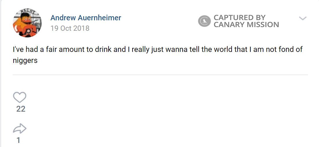 On October 19, 2018, Auernheimer wrote on vk.com: “I've had a fair amount to drink and I really just wanna tell the world that I am not fond of n**gers.”On May 31, 2018, Auernheimer wrote on vk.com: “i hate n**gers.”