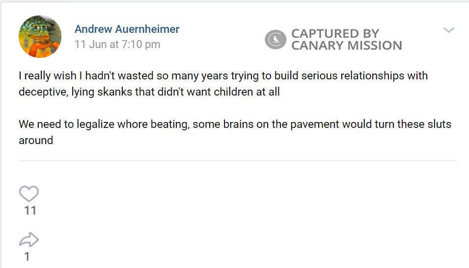 On June 11, 2018, Auernheimer wrote on vk.com: “...We need to legalize whore beating, some brains on the pavement would turn these sluts around.”