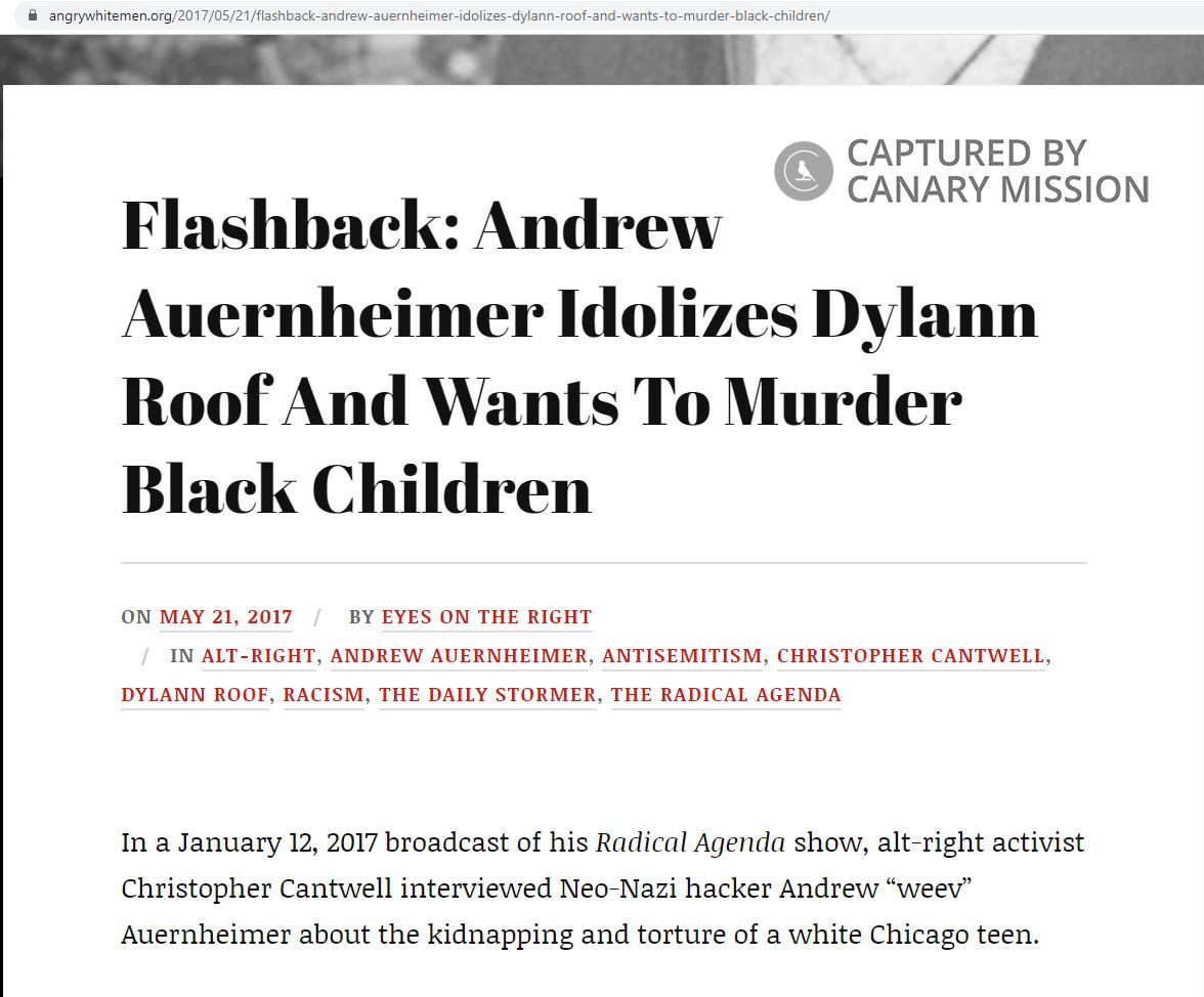 On January 12, 2020, Auernheimer featured in a video shared on Bitchute where he was a guest on Christopher Cantwell’s podcast “Radical Agenda.”Auernheimer said [00:00:57]: “I personally think that people like Dylann Roof are heroes… and I’m not gonna larp. You know, I’m not gonna apologize. I’ve been under assault by minorities my whole life.”