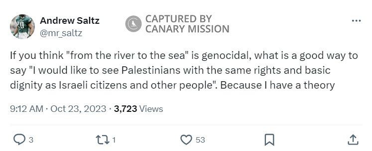 On October 9, 2023, two days after Hamas terrorists attacked Israel, Saltz posted on X: “...the whole things boils down to this: What do you want them to do? What does legitimate and effective resistance look like under these conditions?”Among anti-Israel activists, the term “resistance” is a euphemism for terrorism and is used to glorify and encourage anti-Israel and anti-Semitic violence.