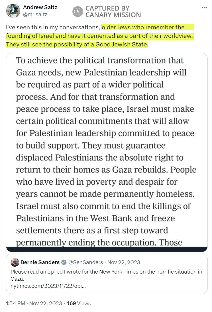 On November 22, 2023, Saltz posted on X: “I’ve seen...older Jews who remember the founding of Israel and have it cemented as a part of their worldview. They still see the possibility of a Good Jewish State.”