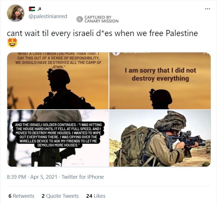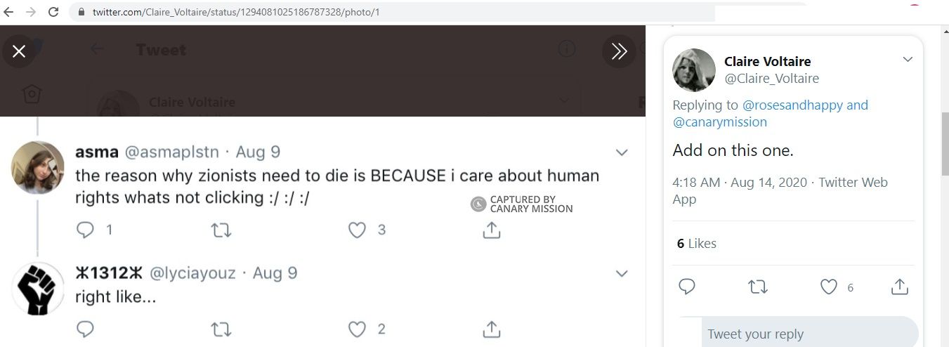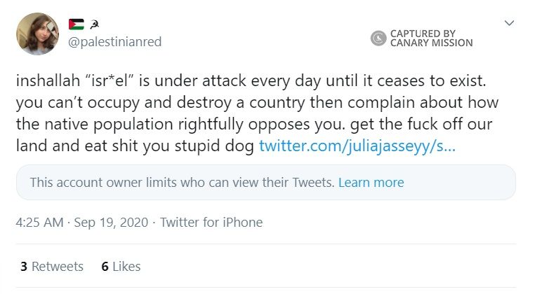 On August 9, 2020, another Twitter user shared a since-deleted tweet from Barakat that said: “being a zi0nist is a death wish because we’re going to k!ll all of you and free Palestine. All threats to our sovereignty will be eradicated inshallah [God willing]💖I love violent resistance so i hope you’re all ready to die for what you believe in!!!”