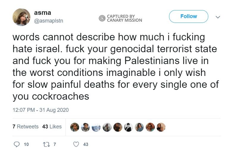 On August 31, 2020, Barakat tweeted: “words cannot describe how much i f**king hate israel. f**k your genocidal terrorist state and f**k you for making Palestinians live in the worst conditions imaginable i only wish for slow painful deaths for every single one of you cockroaches.”