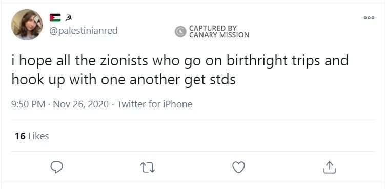 .”On November 26, 2020, Barakat tweeted: “i hope all the zionists who go on birthright trips and hook up with one another get stds."