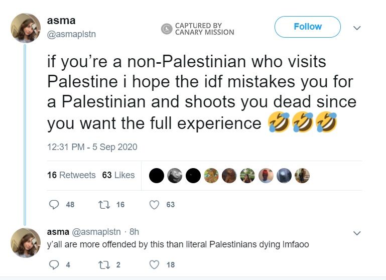 On September 5, 2020, Barakat tweeted: “if you’re a non-Palestinian who visits Palestine i hope the idf [Israel Defense Forces] mistakes you for a Palestinian and shoots you dead since you want the full experience 🤣🤣🤣.”
