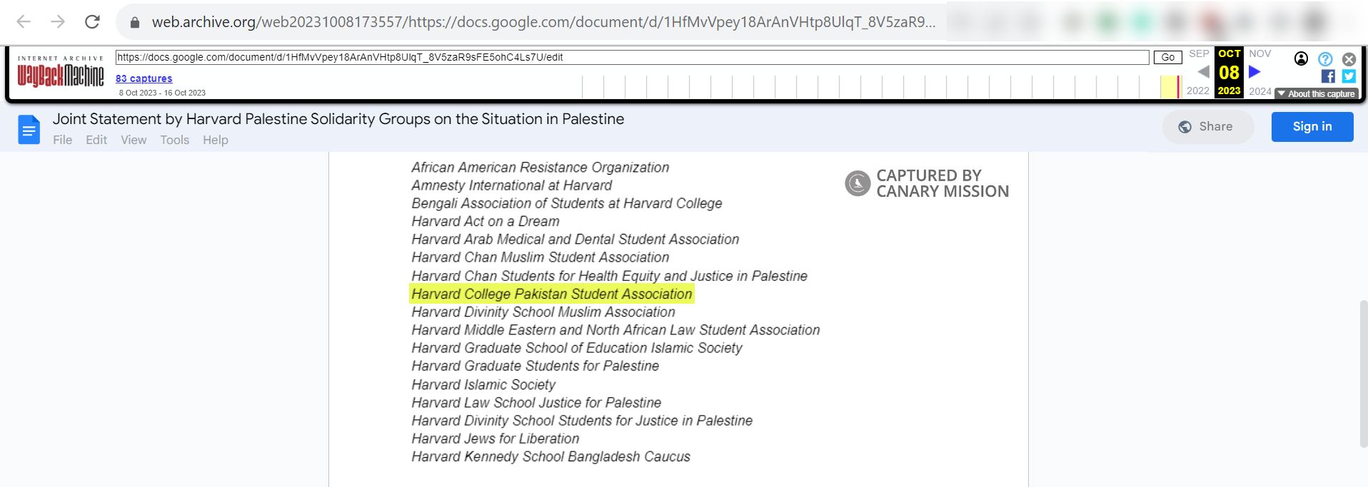 Three Harvard student groups where Safi has been an activist signed the PSC statement. In November 2023, Safi’s Twitter bio said he organized with Harvard South Asians for Forward-Thinking Advocacy and Research (SAFAR). In the 2020-2021 academic year, he held senior leadership positions in the Harvard College Pakistan Students Association (HCPSA) and the Harvard Pakistan Forum (HPF).