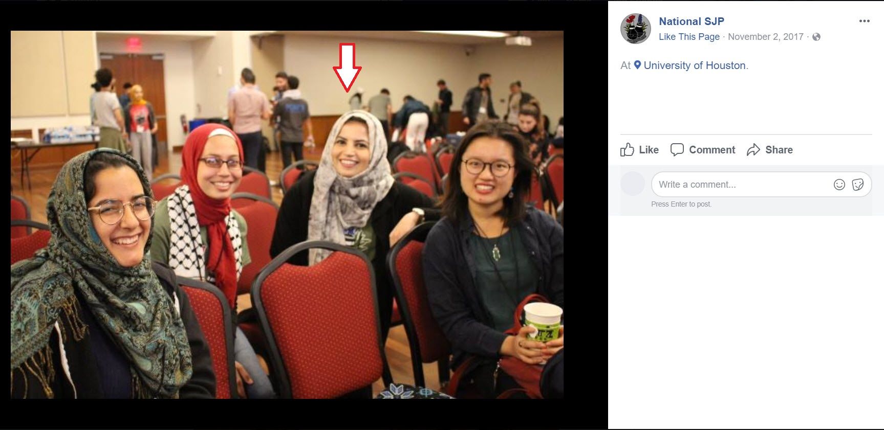 On October 1, 2017, SJP UH shared a Facebook post that read: “17 years ago today, 12yr old Muhammad Al-Durra was shot dead on LIVE TV in his father's arms.#Coogs4Palestine #FreePalestine.”