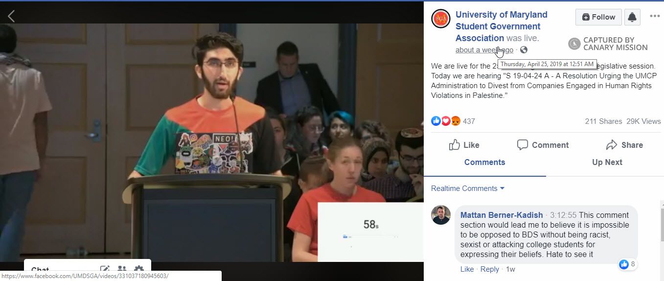 On April 25, 2019, Divest UMD announced on Facebook that following a UMD student government meeting to vote on the Divest UMD BDS bill held a day earlier, the bill failed with “a vote of 9 for, 25 against, and 2 abstentions.”