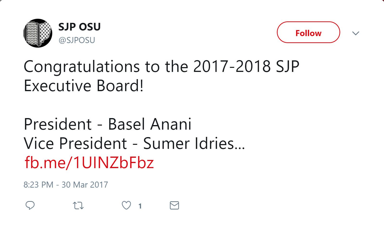 On October 30, 2013, SJP OSU posted an Al-Jazeera article on Facebook titled “Shutdown of Al-Aqsa mosque a ‘declaration of war’ say Palestinian leaders.”
