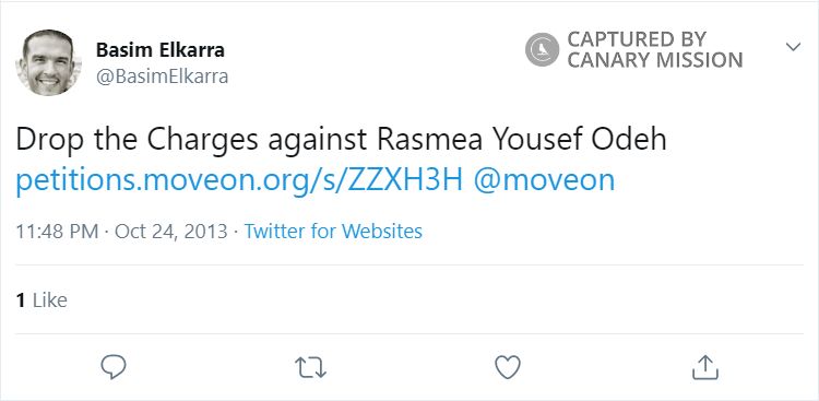 On October 24, 2013, Elkarra tweeted: “Drop the Charges against Rasmea Yousef Odeh petitions.moveon.org/s/ZZXH3H @moveon.”Odeh was a military operative with the Popular Front for the Liberation of Palestine (PFLP), an internationally designated terrorist organization. In 1969, she masterminded a bombing that killed two university students in a Jerusalem supermarket. Odeh also attempted to bomb the British consulate.