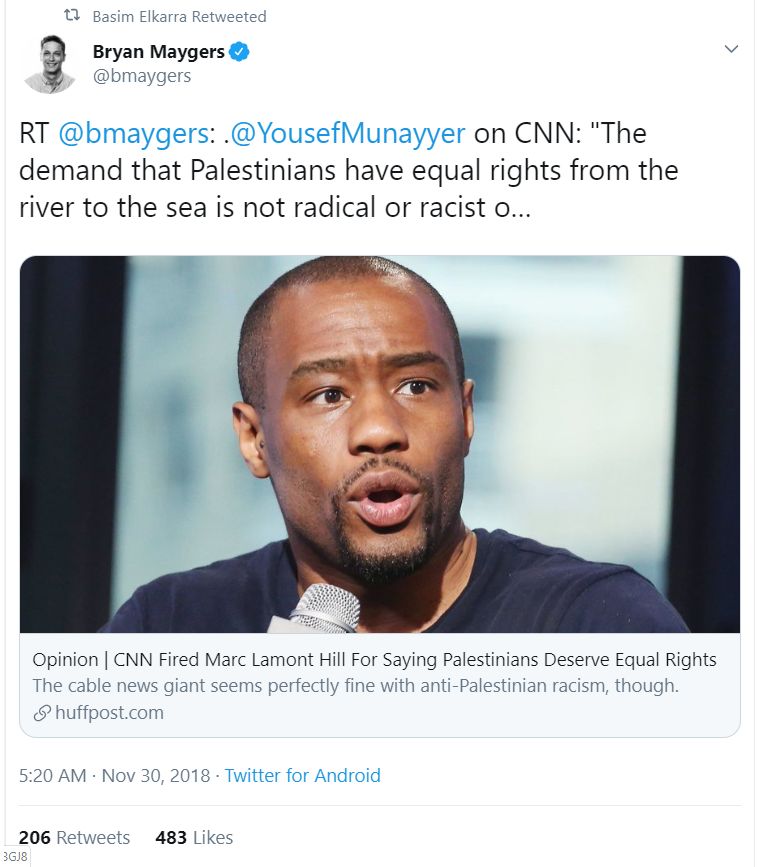 Elkarra retweeted a November 30, 2018 tweet featuring an article about Marc Lamont Hill. The November 30, 2018 tweet said: “RT @bmaygers: @YousefMunayyer on CNN: ‘The demand that Palestinians have equal rights from the river to the sea is not radical or racist or bigoted. Rather, anything short of that would be’."In November 2018, Marc Lamont Hill was fired from his position as a contributor to CNN News network following controversial comments he made during a meeting held at the United Nations for an “International Day of Solidarity with the Palestinian People.”