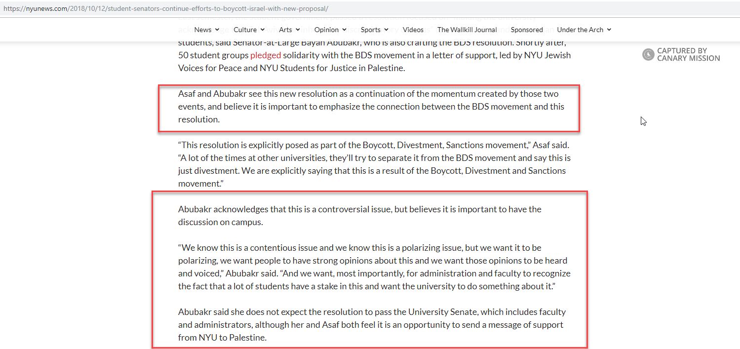 Prior to presenting the BDS resolution to the NYU SGA, Abubakr said of the BDS resolution in an October 12, 2018 interview with NYU’s student newspaper, Washington Square News: “We know this is a contentious issue and we know this is a polarizing issue, but we want it to be polarizing.”