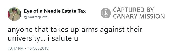 On October 15, 2018, Zinevich tweeted: “anyone that takes up arms against their university... i salute u.”On August 7, 2018, Zinevich tweeted: “honestly? death to israel.”