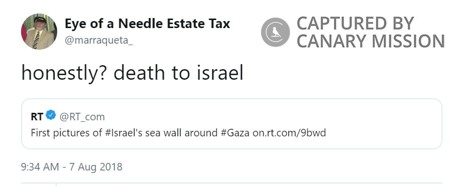 Benjamin Zinevich [Benjamin Zinevich-Rodríguez] has promoted violence, spread hatred of Israel and defended anti-Israel agitators. Zinevich signed a petition condemning the Anti-Semitism Awareness Act (AAA) , a bipartisan bill drafted in response to growing anti-Semitism in the United States and passed unanimously by the U.S. Senate.He also promoted the #returnthebirthright initiative launched by the anti-Israel group Jewish Voice for Peace (JVP) against the Birthright Jewish heritage tour (Birthright).