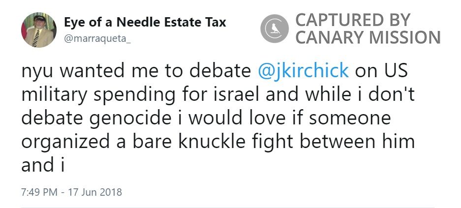 On June 17, 2018, Zinevich tweeted: “nyu wanted me to debate @jkirchick on US military spending for israel and while i don't debate genocide i would love if someone organized a bare knuckle fight between him and i.”