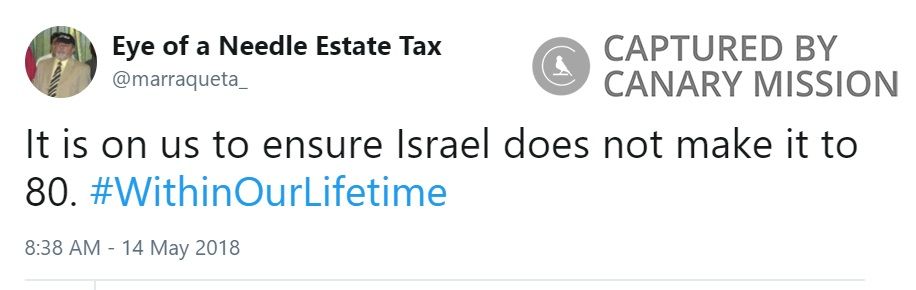 On May 14, 2018, Zinevich tweeted: “It is on us to ensure Israel does not make it to 80. #WithinOurLifetime.”