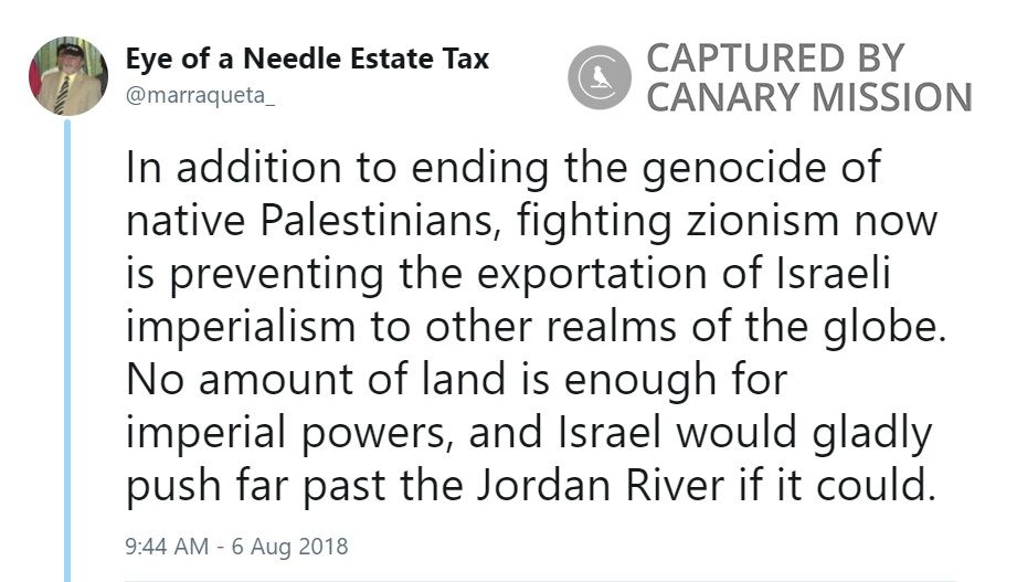 On August 6, 2018, Zinevich tweeted: “In addition to ending the genocide of native Palestinians, fighting zionism now is preventing the exportation of Israeli imperialism to other realms of the globe. No amount of land is enough for imperial powers, and Israel would gladly push far past the Jordan River if it could.”