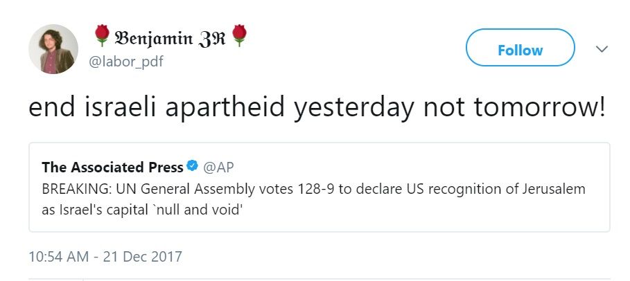 On December 21, 2017, Zinevich tweeted a headline from the Associated Press (AP) that read: “BREAKING: UN General Assembly votes 128-9 to declare US recognition of Jerusalem as Israel’s capital ‘null and void.’ Zinevich commented: “end israeli apartheid yesterday not tomorrow!”