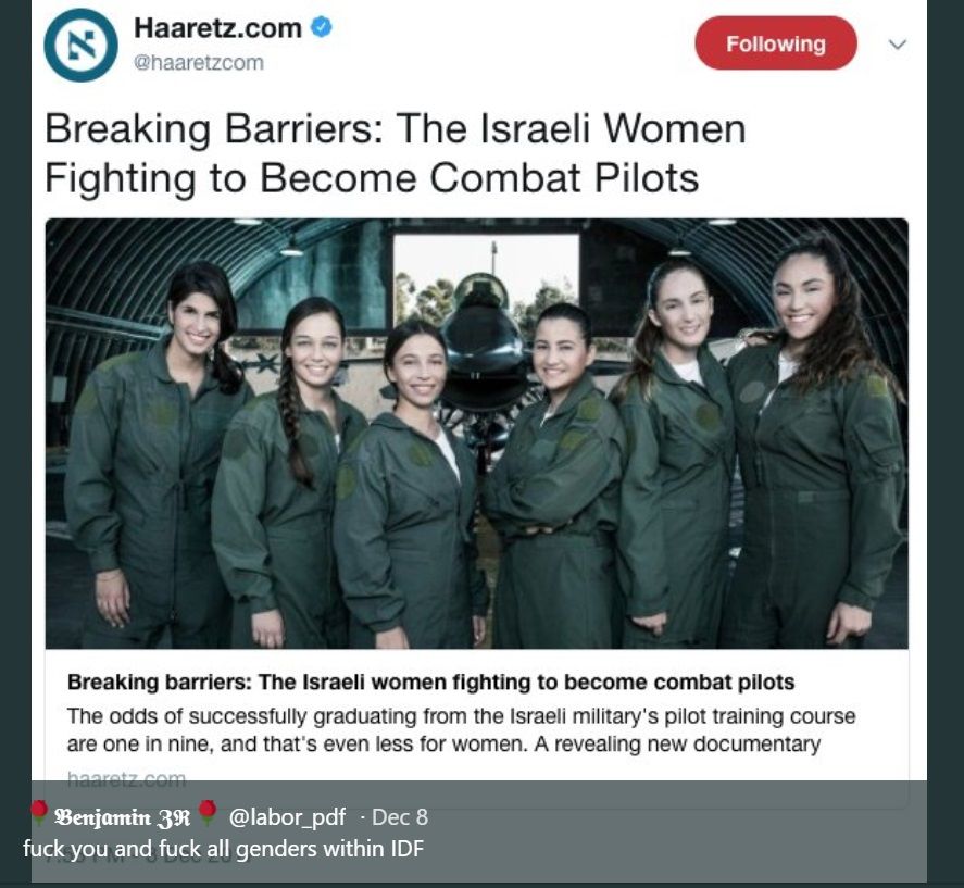 On December 8, 2017, Zinevich tweeted a screenshot of a Haaretz article with the headline: “Breaking Barriers: The Israeli Women Fighting to Become Combat Pilots.” Zinevich commented: “f**k you and f**k all genders within the IDF.”