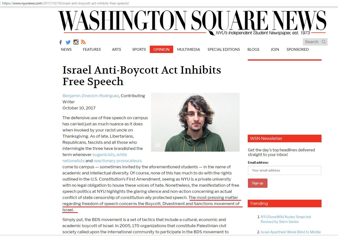 On October 10, 2017, Zinevich wrote an article for the Washington Square News titled: “Israel Anti-Boycott Act Inhibits Free Speech.” In the article, Zinevich maintained: “The most pressing matter regarding freedom of speech concerns the Boycott, Divestment and Sanctions movement of Israel.”