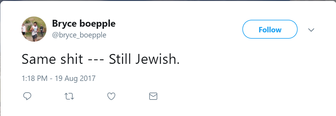 On August 20, 2017, Boepple retweeted a tweet that said: “The red pill is hard because after 600 ‘holocaust’ movies you become subconsciously reluctant to put jews under objective analysis.”On August 19, 2017, Boepple tweeted: “This just in: CNN digs up jewish garbage from a post war propaganda trash heap, more at 7:00.” His comment was in response to a CNN tweet that read: “This 1947 educational film, viewed millions of times on FB, warns against the spread of white nationalism in the US.”