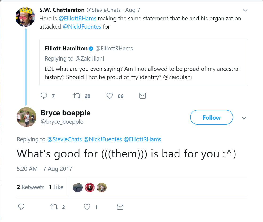 On August 7, 2017, Boepple tweeted: “What's good for (((them))) is bad for you :^).”