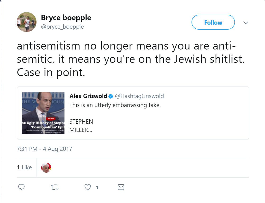 On August 4, 2017, Boepple tweeted: “antisemitism no longer means you are anti-semitic, it means you're on the Jewish s**tlist. Case in point.”
