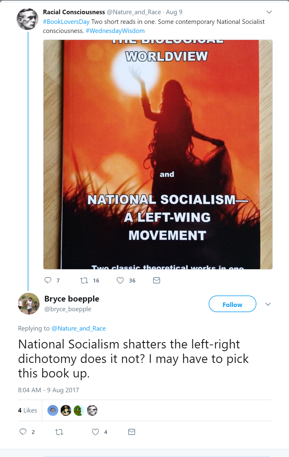 On August 20, 2017, Boepple retweeted a tweet with an excerpt from Mein Kampf from the neo-Nazi Twitter user @Third_Position.On August 9, 2017, Boepple tweeted: “National Socialism shatters the left-right dichotomy does it not? I may have to pick this book up.” He was tweeting about a book titled “National-Socialism — The Biological Worldview and National Socialism — a Left-Wing Movement. Two classic theoretical works in one. Povl H. Riis-Knudsen.”