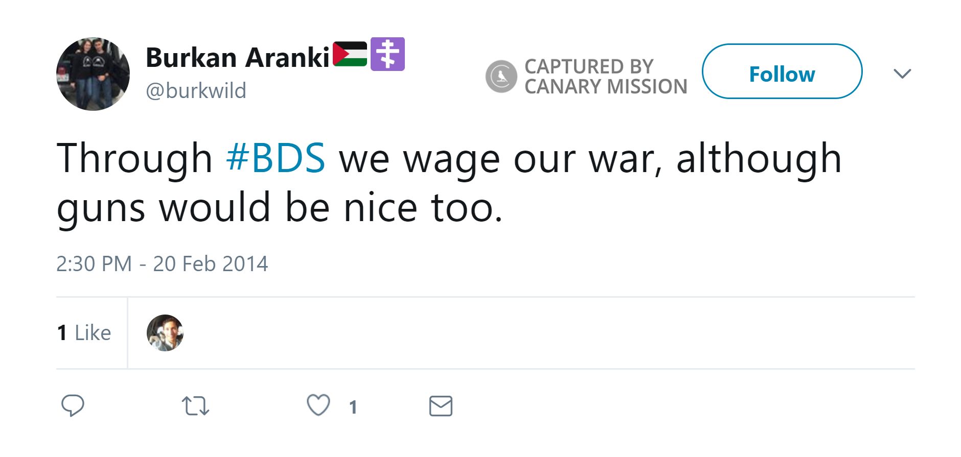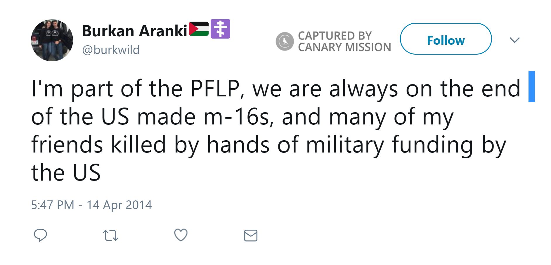 On March 6, 2014, Aranki tweeted: “I don’t want a two state solution. I want the complete and utter destruction of Israel.”