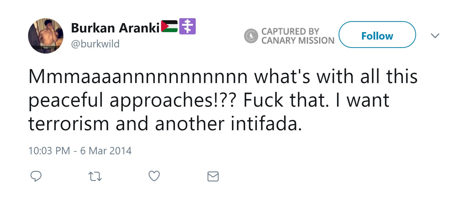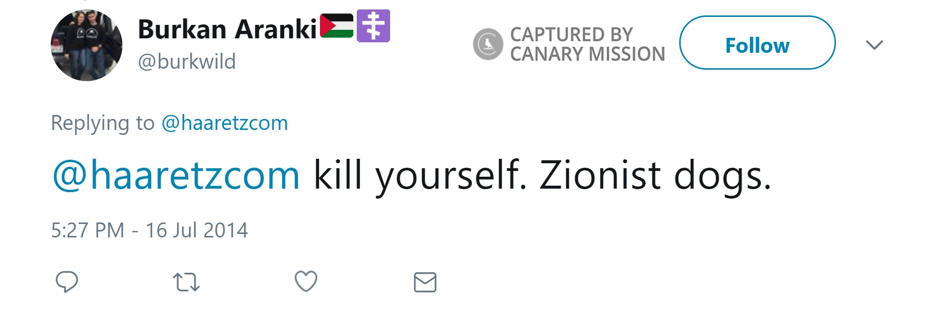 On July 16, 2014, Aranki tweeted: “@haaretzcom kill yourself. Zionist dogs.”
