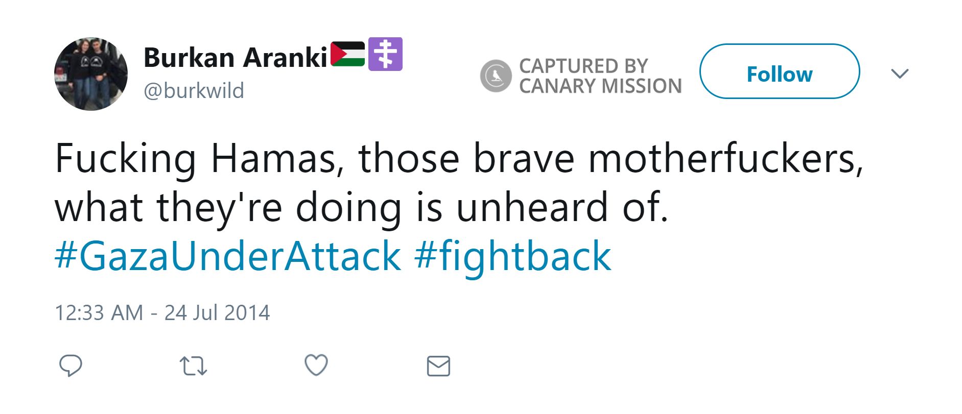 .”On July 24, 2014, during Operation Protective Edge (OPE), Aranki tweeted: “F**king Hamas, those brave motherf**kers, what they're doing is unheard of. #GazaUnderAttack #fightback.”