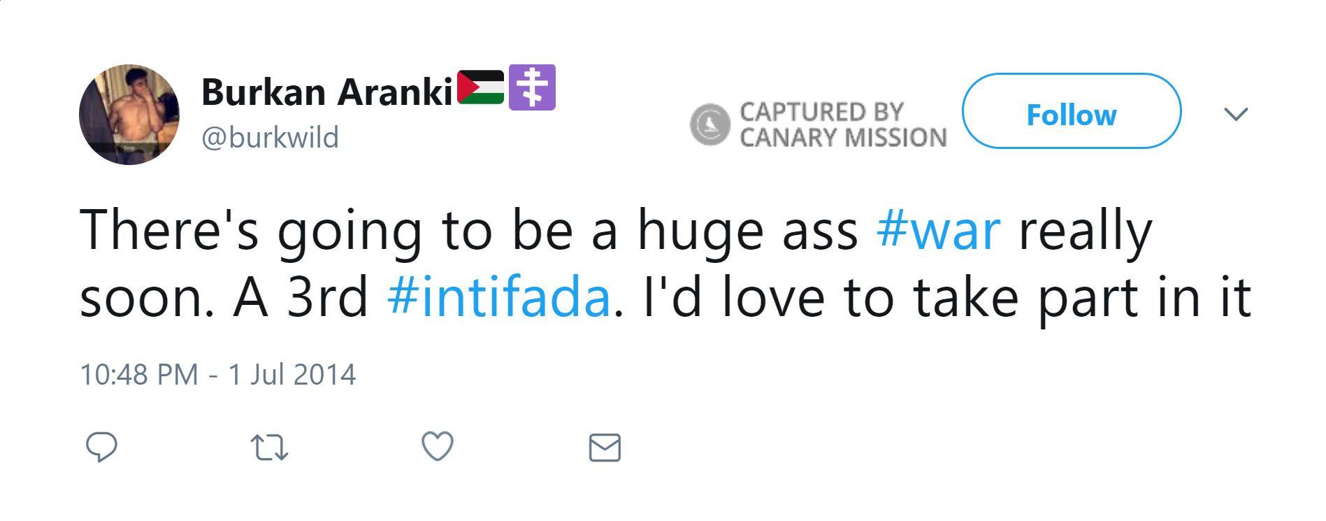 On July 1, 2014, Aranki tweeted: “There's going to be a huge a** #war really soon. A 3rd #intifada. I'd love to take part in it.”