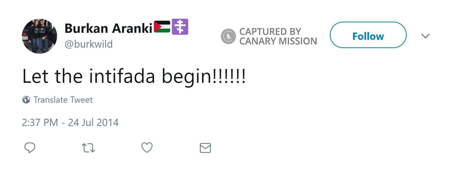 On July 24, 2014, Aranki tweeted: “The #intifada will happen, my home town, Birziet better be the first Militarize and fight till freedom or death.”