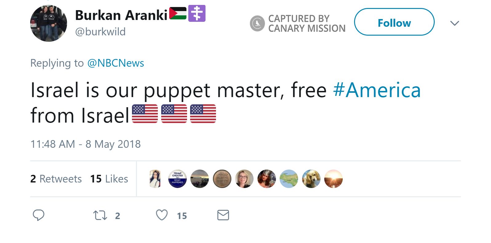 On May 8, 2018, Aranki tweeted: “Israel is our puppet master, free #America from Israel
