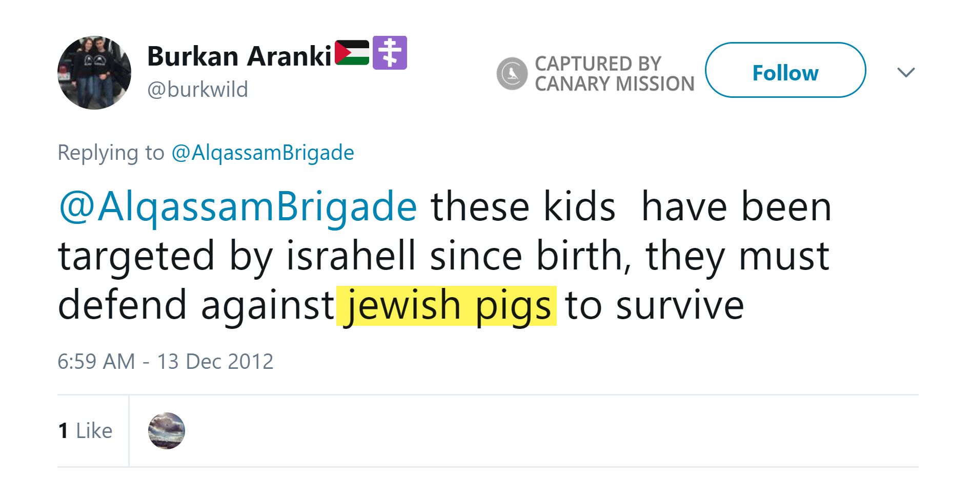 On December 13, 2012, Aranki tweeted: “@AlqassamBrigade these kids have been targeted by israhell since birth, they must defend against jewish pigs to survive.”