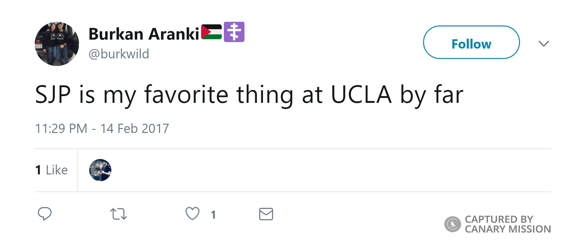 On February 15, 2017, Aranki tweeted a photo of himself featured on SJP at UCLA’s Instagram account, adding: “I'm famous af #freepalestine.”On the same day, Aranki tweeted: “met a long time role model of mine this week @Remroum,” along with a photo of anti-Israel propagandist Remi Kanazi. Kanazi has justified terrorism, belittled the Holocaust and demonized Jews. He has also supported terrorists, compared Zionists to the KKK and spread hatred of Israel.