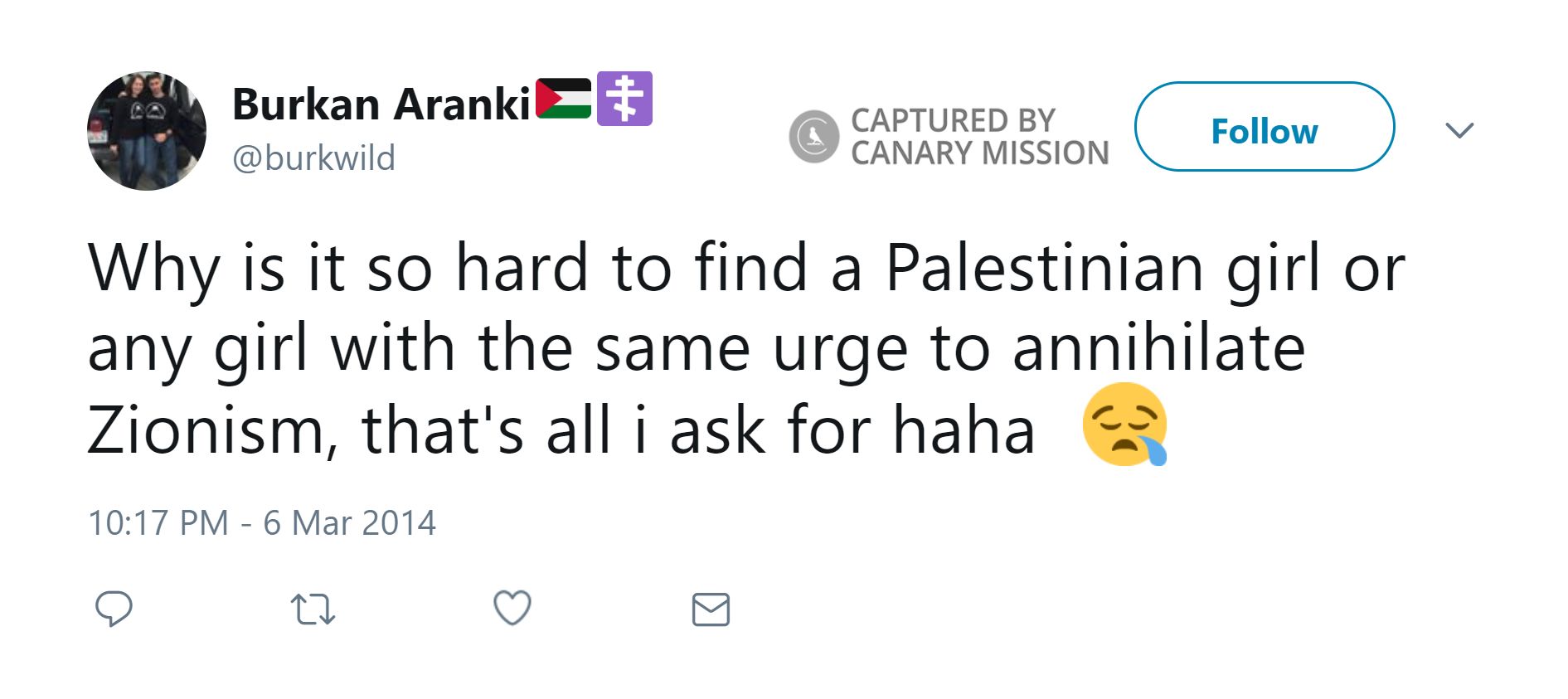 On that same day Aranki tweeted: “Why is it so hard to find a Palestinian girl or any girl with the same urge to annihilate Zionism, that's all i ask for haha