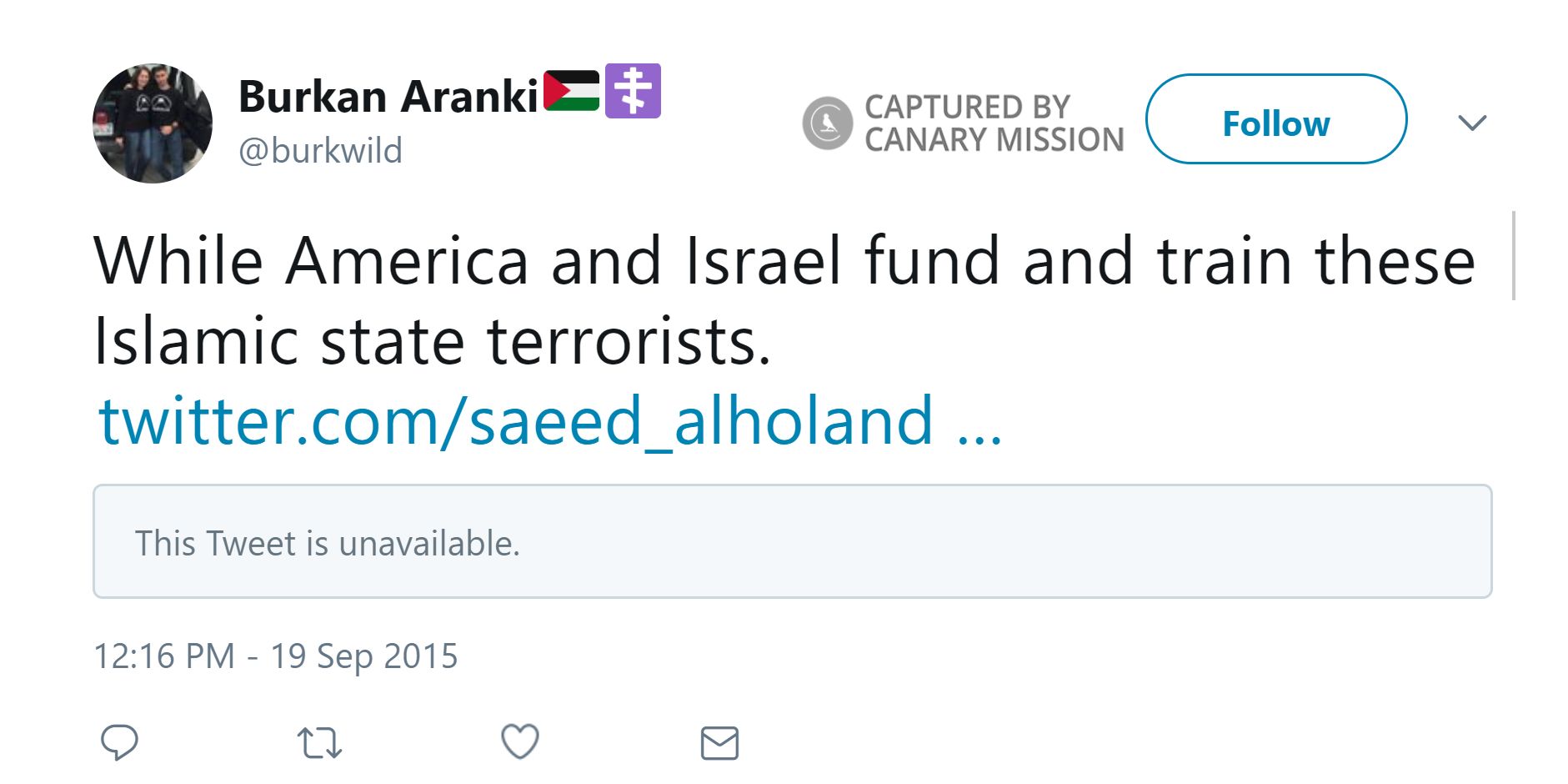 .”On September 19, 2015, Aranki tweeted: “While America and Israel fund and train these Islamic state terrorists.”