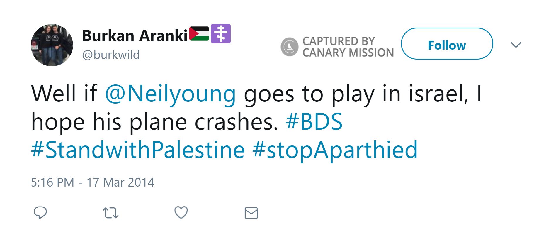 On February 20, 2014, Aranki tweeted: “Through #BDS we wage our war, although guns would be nice too.”On March 17, 2014, Aranki tweeted: “Well if @Neilyoung goes to play in israel, I hope his plane crashes. #BDS #StandwithPalestine #stopAparthied.”