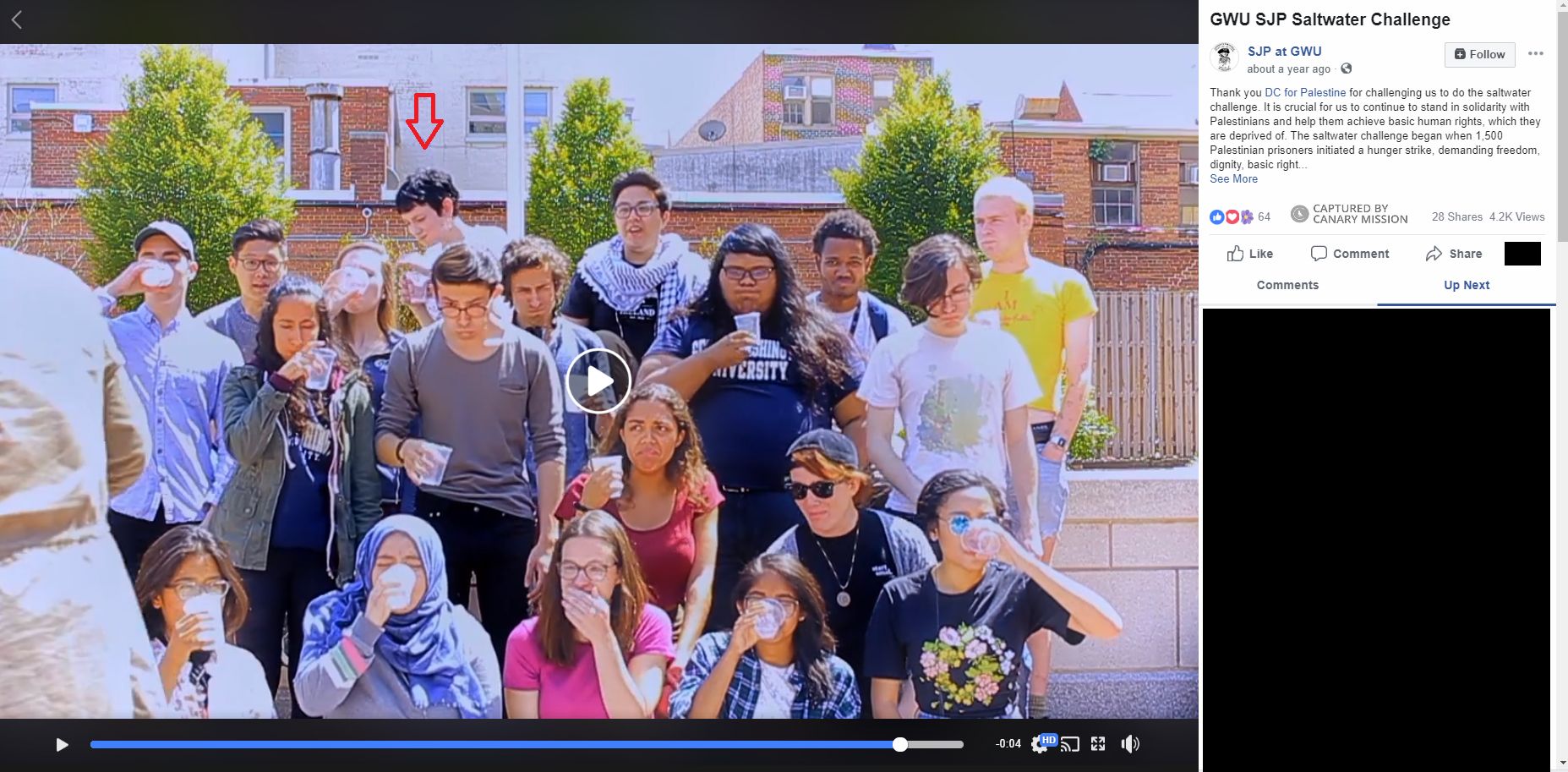 On May 12, 2017, Maryam Alhassani — led SJP at GWU student activists in a “Saltwater Challenge,” in solidarity with Palestinian prisoners then hunger striking in Israeli prisons.SJP at GWU - Hosting Right to Education Tour 2016
