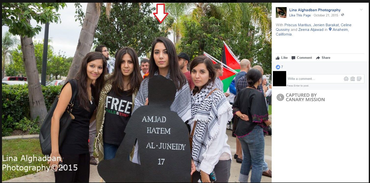On October 21, 2015, Qussiny posed for a Facebook photo at an anti-Israel rally with a silhouette labeled: “Amjad Hatem Al-Juneidy 17.”
