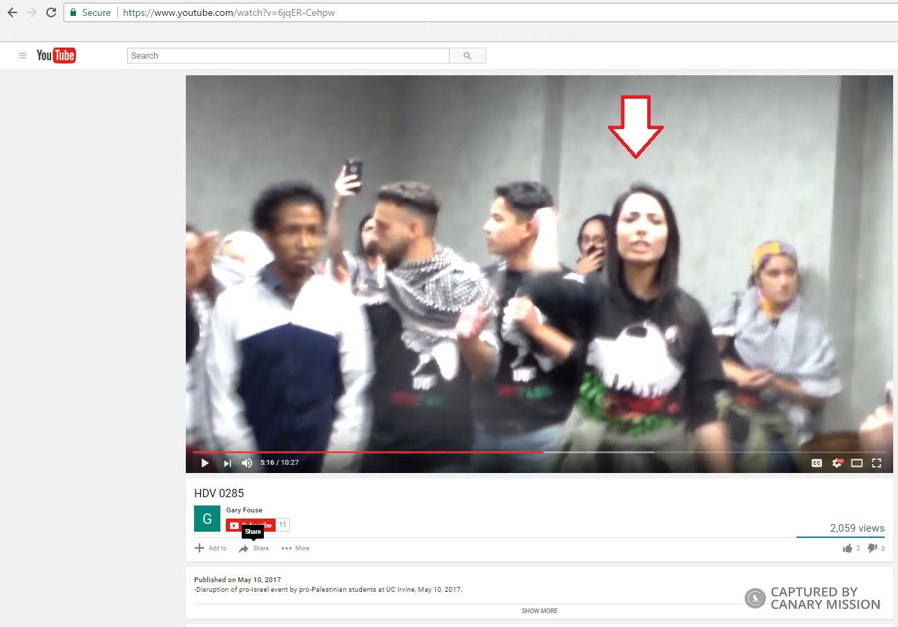 On May 19, 2016, Qussiny appeared in a Youtube video where she led [00:00:46] SJP UCI activists during a disruption of a pro-Israel event at UCI, shouting [00:00:46] “Intifada, Intifada - Long live the Intifada” and “when people are occupied, resistance is justified”Since the early 2000s, the term “intifada,” which translates from Arabic as “uprising” or “insurrection,” has carried the connotation of violence.