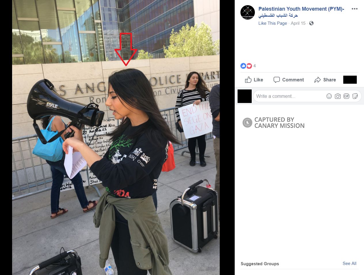 On November 30, 2015, PYM displayed a photo on Facebook from one of the rallies showing a sign in support of PFLP member Khalida Jarrar, who confessed to inciting violence and calling for terrorists to abduct Israel Defense Forces (IDF) soldiers.