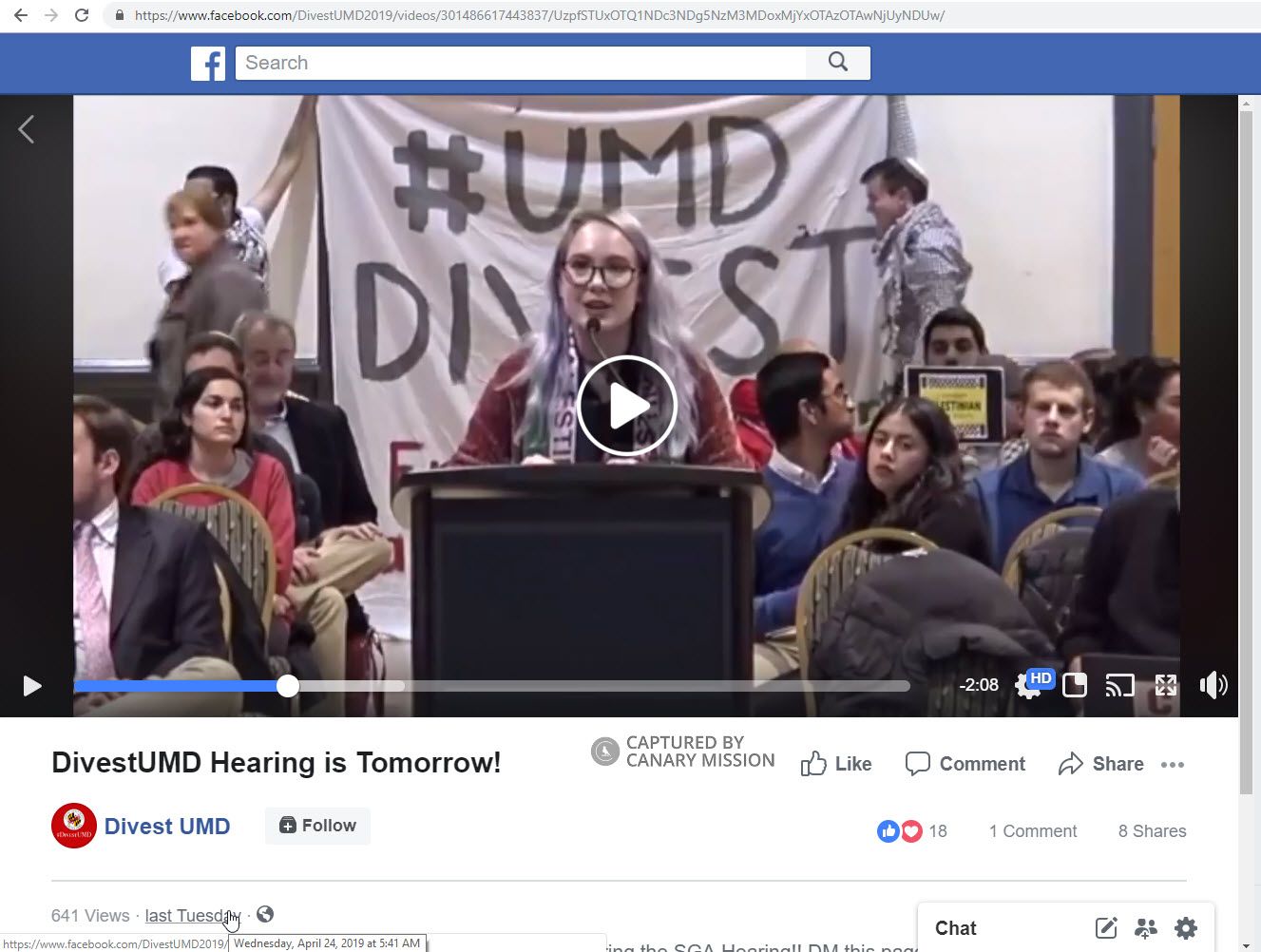 On April 24, 2019, Danyo featured in a Facebook video posted by Divest UMD, speaking before the UMD Student Government Association (SGA), where she said [00:00:43]: “My name’s Chloe Danyo, I’m a Sophomore History major, I’m a Jew and I urge you all to support BDS.”Divest UMD is a campaign that calls on UMD to divest from companies that do business with Israel.
