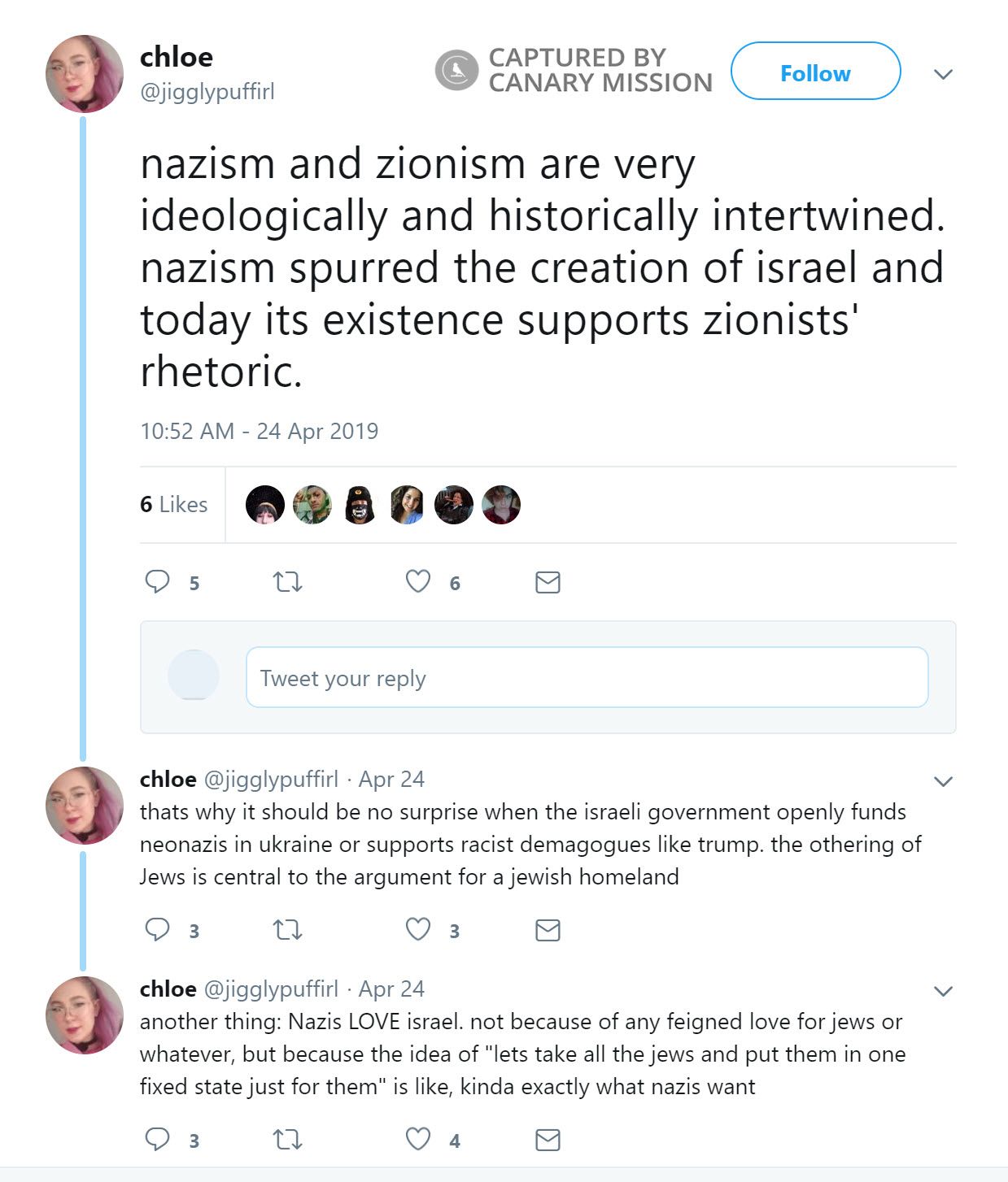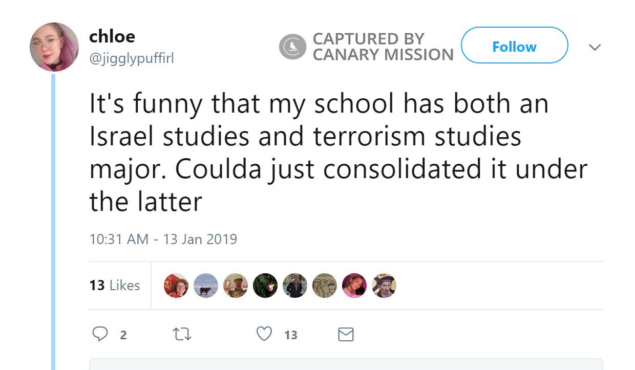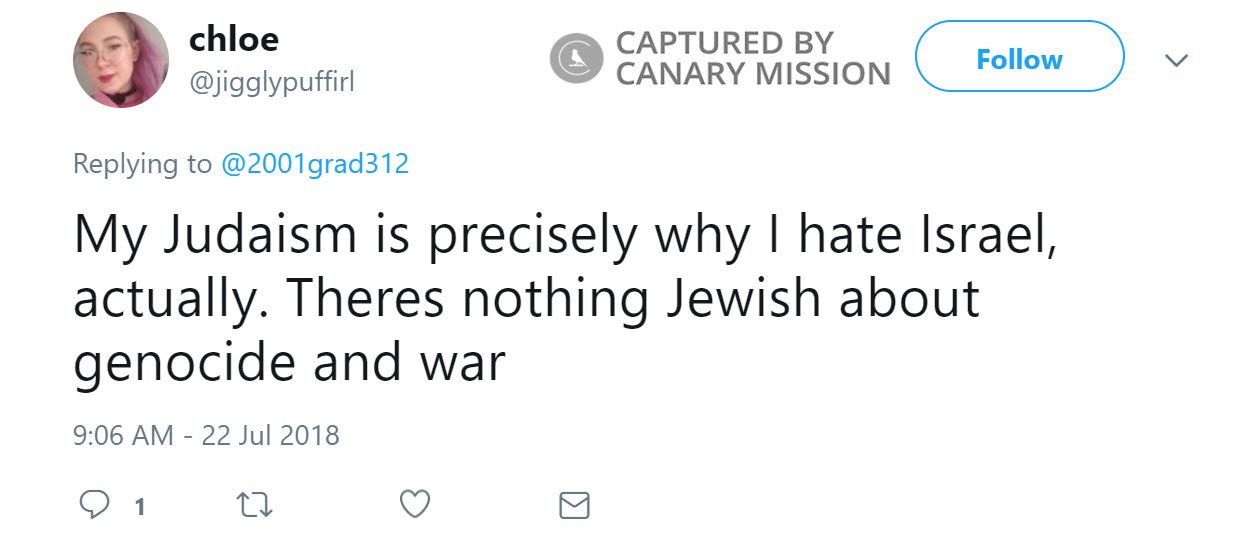 Chloe Danyo has equated Zionism with Nazism and spread hatred of Israel on Twitter. Danyo was an activist with Students for Justice in Palestine (SJP) at the University of Maryland (UMD) in 2018 and 2017.Danyo is a supporter of the Boycott, Divestment, Sanctions (BDS) movement.