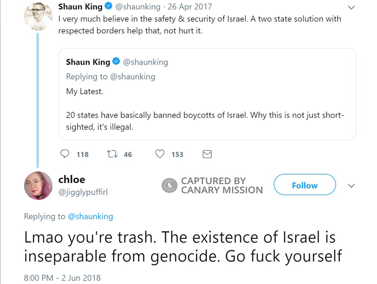 On June 2, 2018, Danyo tweeted: “Lmao you're trash. The existence of Israel is inseparable from genocide. Go f**k yourself.”