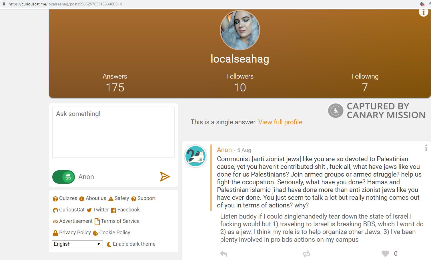 On August 5, 2018, Danyo wrote on Curiouscat: “Listen buddy if I could singlehandedly tear down the state of Israel I f**king would but 1) traveling to Israel is breaking BDS, which I won't do 2) as a jew, I think my role is to help organize other Jews. 3) I've been plenty involved in pro bds actions on my campus.”