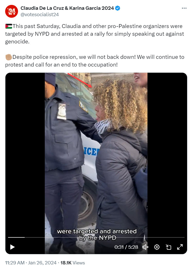 De la Cruz continued [00:36:50]: “It is important for us to see what’s happening in the city right now. Why does NYPD [New York Police Department] want to shut down the sound? Because the people running this city support Zionism. Are we okay with that? No we’re not.”