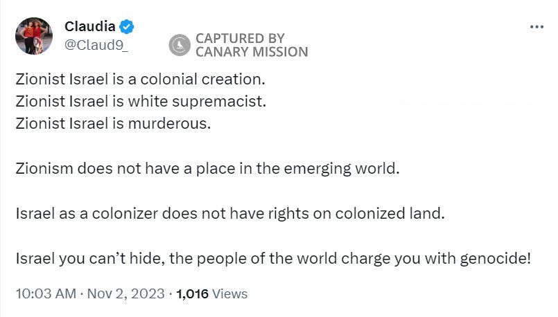 On November 2, 2023, De la Cruz tweeted: “Zionist Israel is a colonial creation.Zionist Israel is white supremacist. Zionist Israel is murderous. Zionism does not have a place in the emerging world. Israel as a colonizer does not have rights on colonized land. Israel you can’t hide, the people of the world charge you with genocide!”