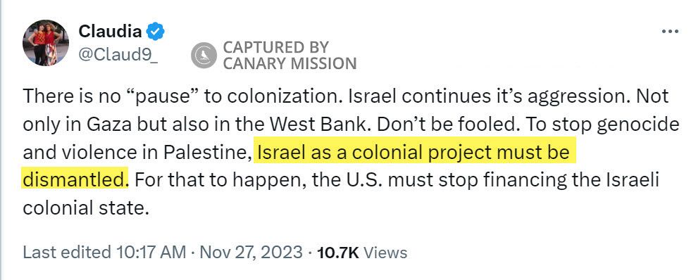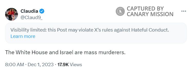 On December 1, 2023, De la Cruz tweeted: “The White House and Israel are mass murderers.”
